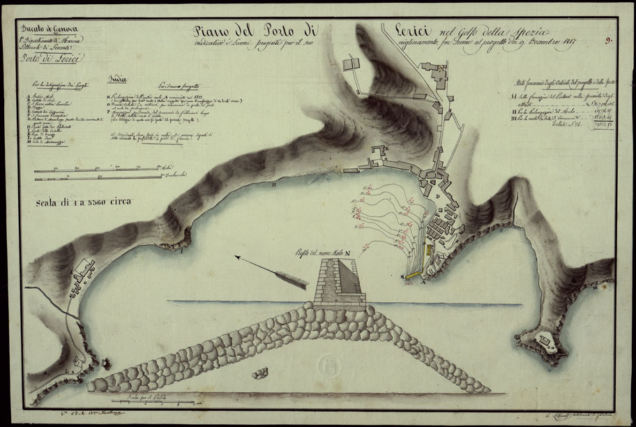 (N:13263) PIANO DEL PORTO DI LERICI NEL GOLFO DELLA SPEZIA INDICATIVO I LAVORI PROPOSTI PER IL SUO MIGLIORAMENTO PER SERVIRE AL PROGETTO DEI 9 DICEMBRE 1817 - DUCATO DI GENOVA 1 DIPARTIMENTO DI MARINA LITTORALE DI LEVANTE PORTO DI LERICI. (CA002989) Carte e stampe antiche: riproduzione digitale a 150 DPI