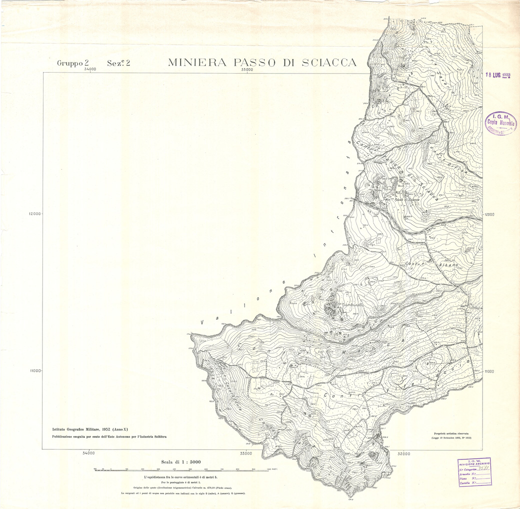 Carta realizzata e pubblicata dall' IGM per conto dell' Ente Autonomo per l' Industria Solfifera, i rilievi furono eseguiti negli anni dal 1930 al 1933 e utilizzati in seguito anche per il completamento delle tavolette alla scala di 1:25.000 della Carta d' Italia.