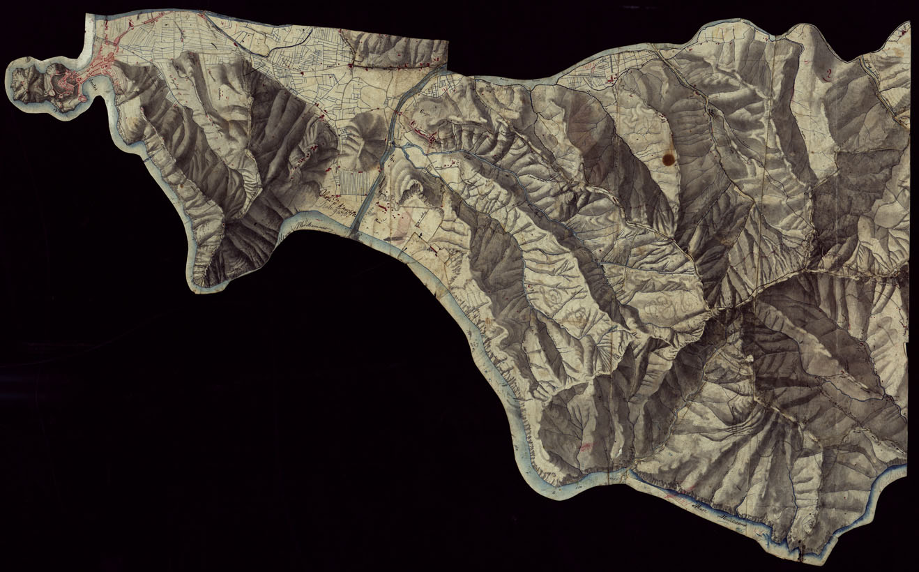 Il titolo non presente sulla carta. Quattro fogli irregolari formati da spezzoni uniti a mosaico, acquerellati a luce obliqua con abitati colorati in rosso ed acque in azzurro.