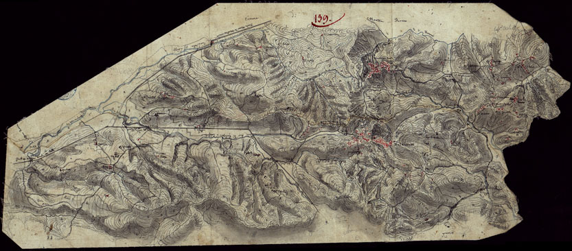 Gruppo di 142 minute di campagna, e un quadro d'unione, in fogli irregolari, alcuni con degli spezzoni allegati, montati su tela. L'orografia vi rappresentata variamente talvolta con curve dimostrative e tratteggio, oppure con sfumo a luce obliqua e tratteggio o con sfumo e curve dimostrative. Gli abitati sono colorati in rosso; le acque in azzurro.