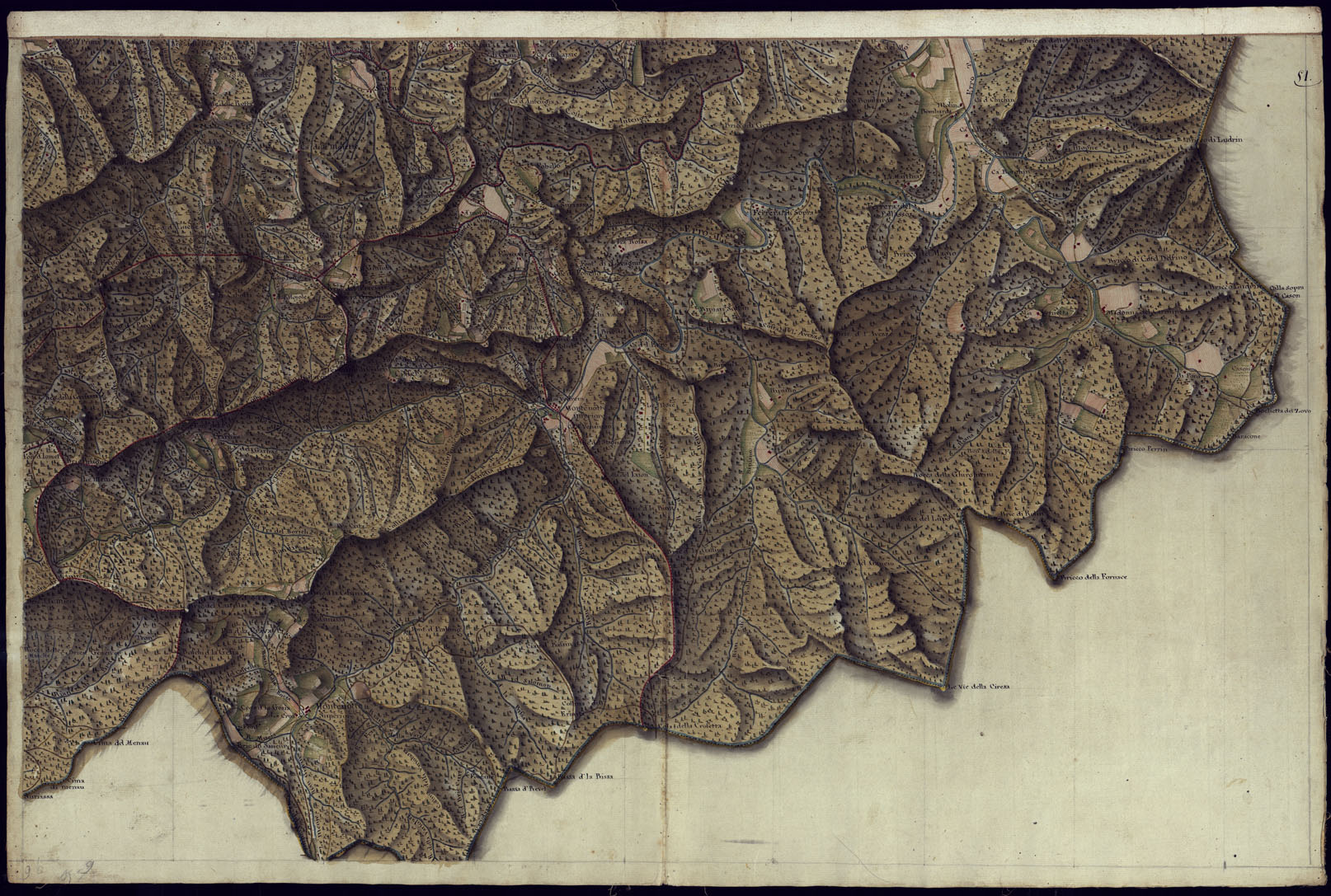 Cinquantasei fogli pi un quadro d'unione, disegnati a penna a pi tinte ed acquerellati. Non portano indicazione di data n di autore, ma si possono ritenere opera della fine del secolo XVIII. Documento topografico del pi grande interesse per la copia grandissima degli elementi topografici che vi sono rappresentati, come comporta la notevole grandezza della scala del disegno e per la chiarezza e l'evidenza artistica della rappresentazione. Le citt e i villaggi sono rappresentati nella loro pianta geometrica dettagliatissima. Ricchissima pure la toponomastica relativa ai centri abitati, corsi d'acqua, strade, regioni. Sono indicate con diverse tinte le differenti zone di coltura.