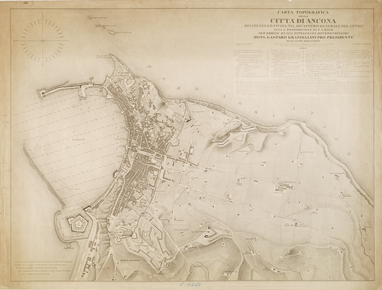 ...DELINEATA ED INCISA NEL DICASTERO GENERALE DEL CENSO NELLA PROPORZIONE DI 1:4.000 PER ORDINE DI SUA ECCELLENZA REVERENDISSIMA MONS. GASPARO GRASSELLINI PRO-PRESIDENTE NELL'ANNO MDCCCXLIV.
