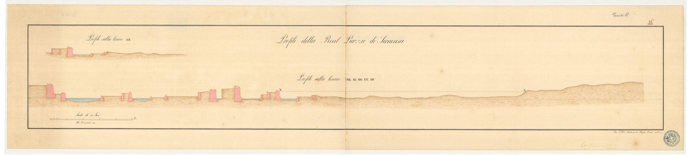 Docum. n. 18. Pianta proveniente dal R. Officio Topografico di Napoli. Quattro fogli acquerellati con orografia a sfumo, costruzioni in rosso, acque in azzurro, vegetazioni e colture in verde, senza nomi, ma sussidiata da elenco numerico delle costruzioni e delle opere militari. Annessi due profili della Real piazza firmati Nicola del Giudice e Ferdinando Cinque, datati al 1826 ed una seconda pianta, in nero, rilevata e disegnata da D. Luigi Visanti, Guardi del Genio di terza classe e D. Luciano Ferraguto, impiegato civile della nona direzione, come da nota manoscritta firmata Pietro B. di Villanova con data agosto 1842. Anche questa pianta (m. 60x91) corredata di elenco numerico delle fortificazioni e costruzioni militari e degli edifici civili e strade.