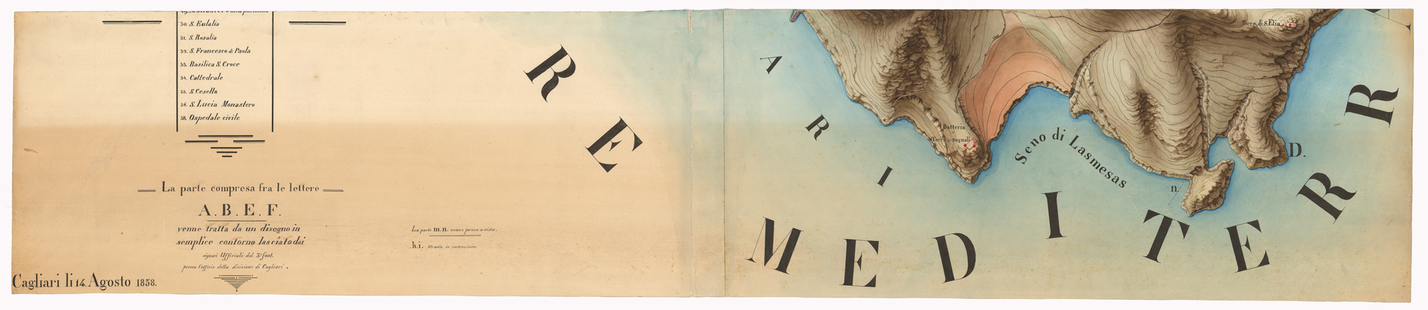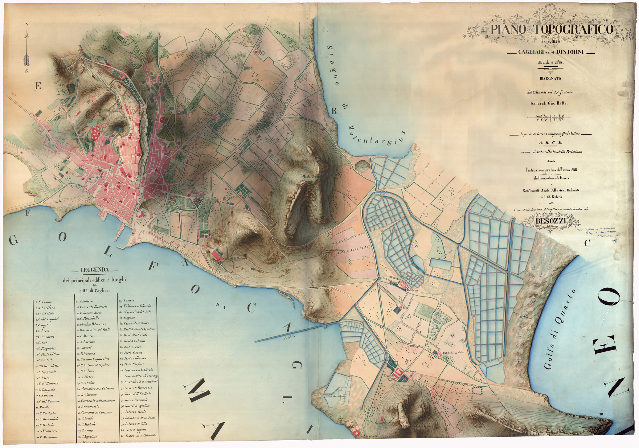 Piano topografico della citt di Cagliari e dintorni disegnato ad acquerello sotto la direzione del capitano G. Besozzi. Porta sul lato destro il visto del Capo di S. M. L. De Bartolomeis.