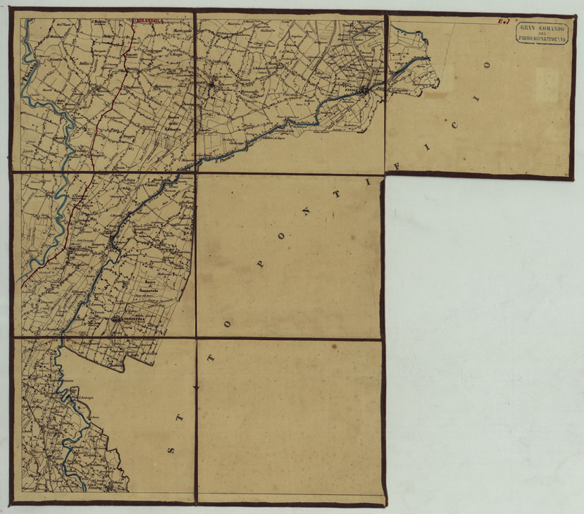 (N:11679) CARTA TOPOGRAFICA DELLA LOMBARDIAE DEI DUCATI DI PARMA, PIACENZA E MODENA ALLA SCALA DEL 1 86.400 DEL VERO DIVISA IN 32 FOGLI. LITOGRAFFIZZATA NELL'UFFICIO TOPOGRAFICO DEL REAL CORPO DI STATO MAGGIORE GENERALE - FOG. E.7 (CA004740) Carte e stampe antiche: riproduzione digitale a 150 DPI