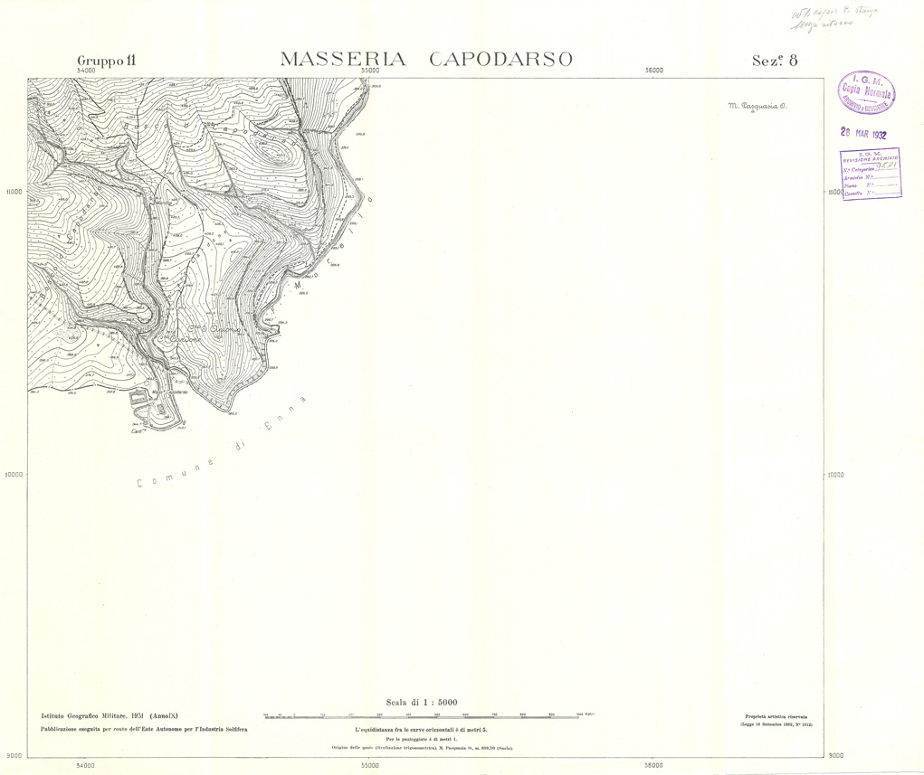Carta realizzata e pubblicata dall' IGM per conto dell' Ente Autonomo per l' Industria Solfifera, i rilievi furono eseguiti negli anni dal 1930 al 1933 e utilizzati in seguito anche per il completamento delle tavolette alla scala di 1:25.000 della Carta d' Italia.