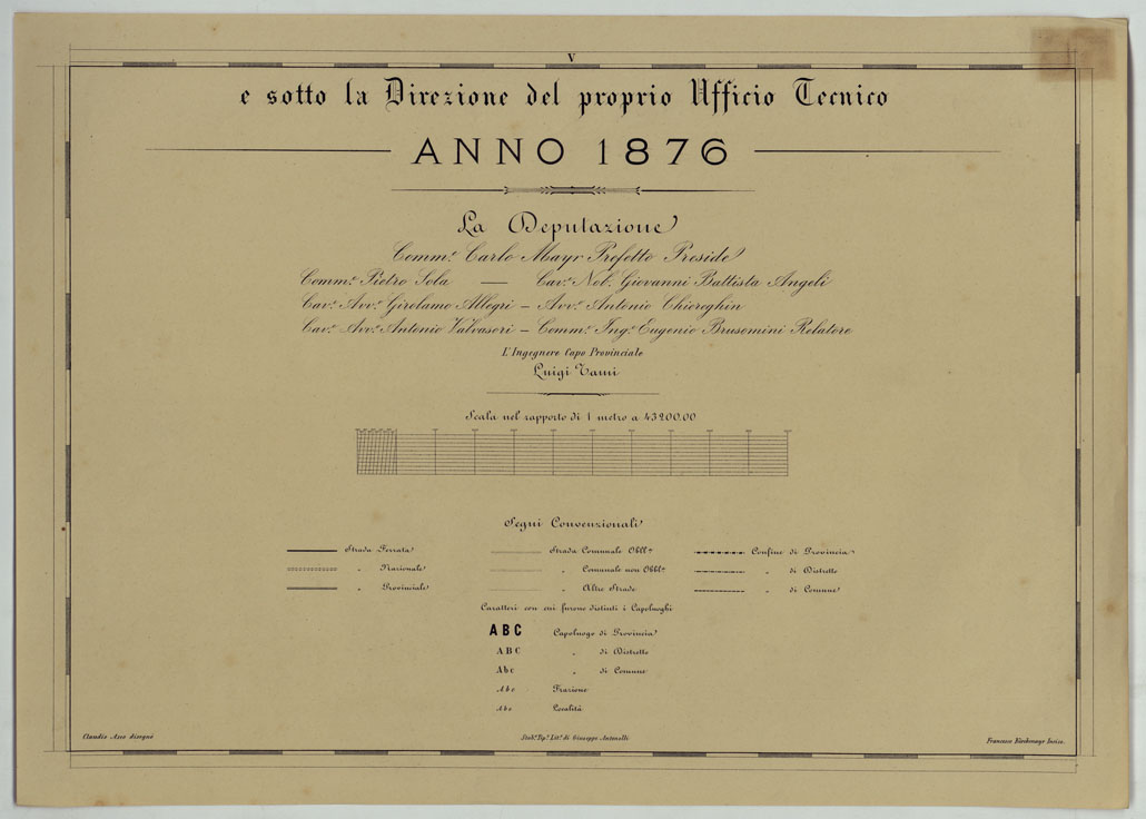 Carta in trentadue fogli notevoli per la chiarezza e nitidezza. Incisione su pietra. Stampa in nero. Distingue gli abitati in base alla loro importanza amministrativa; mostra le ferrovie, le strade (classificate in nazionali, provinciali e comunali), i confini di provincia, di distretto, di comune, ecc. I fogli NI e V contengano il titolo, la scala e la leggenda dei segni convenzionali; il foglio N11 reca il quadro d'unione. I fogli N 16,20,23,24,28 contengano rispettivamente piante di Malamocco, Venezia (1:10.000), Chioggia, Mestre, Mirano, Dolo e S. Don (8.000). Il foglio N29 reca una "Tavola Poliometrica della Provincia di Venezia indicante la distanza da Comune a Comune, e di ciascun Comune del Capoluogo di Provincia" e il foglio N32 un "Prospetto dimostrativo della popolazione della Provincia di Venezia giusta l'ultimo censimento approvato con R. decreto 15 Dicembre 1872".