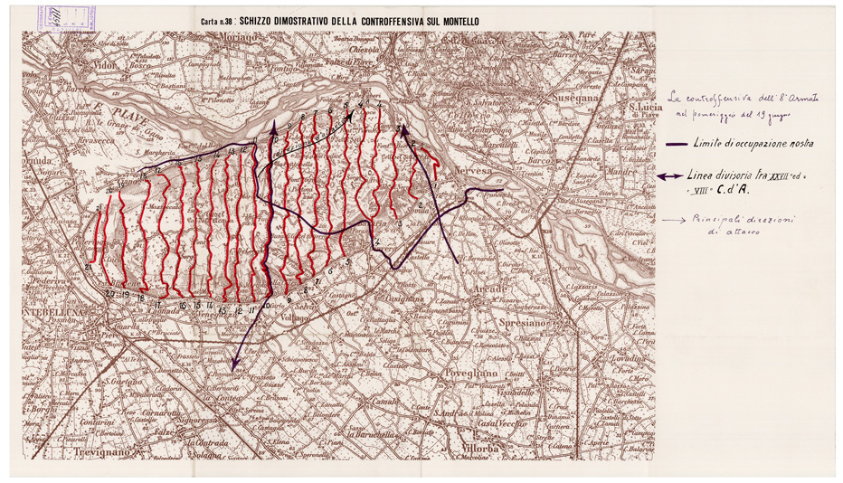 L'ESERCITO ITALIANO NELLA GRANDE GUERRA (1915-1918), Volume V, Le operazioni del 1918 - Tomo 1 ter, Gli avvenimenti dal gennaio al giugno (Carte e schizzi), N. inv. 45171 , Pos. 47-4-17. Carta n. 38: SCHIZZO DIMOSTRATIVO DELLA CONTROFFENSIVA SUL MONTELLO