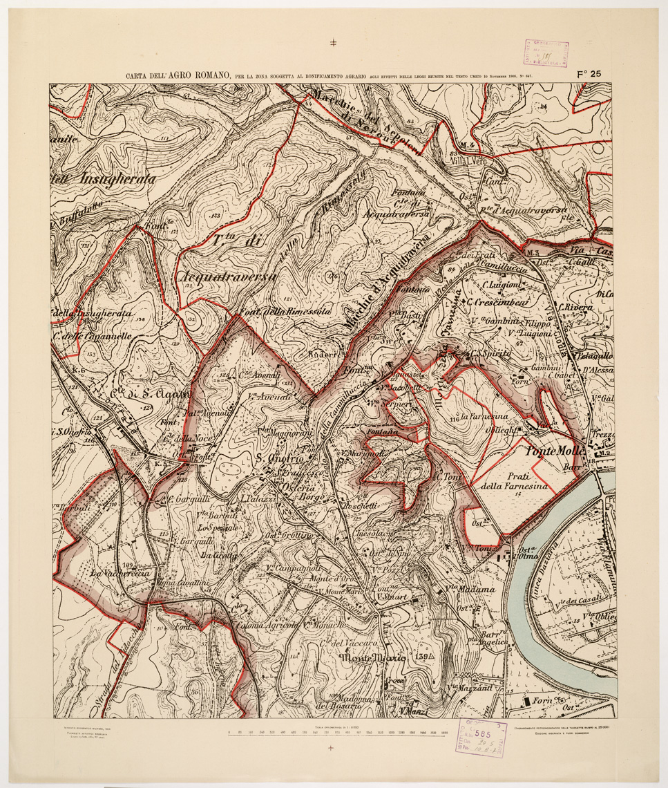 Ingrandimento fotozincografico in 77 fogli delle tavolette rilievo al 25.000. Stampa a colori in azzurro per le acque, verde per i limiti dell'agro romano, rosso per quelli della zona soggetta alla bonifica agraria, viola per il territorio suburbano di Roma, rosso per le tenute e le loro divisioni interne; azzurro per le linee di spartiacque; resto della planimetria in nero. Orografia a curve tracciate alla equidistanza di 5 metri. Annesso un quadro d'unione con elenco delle tenute private.
