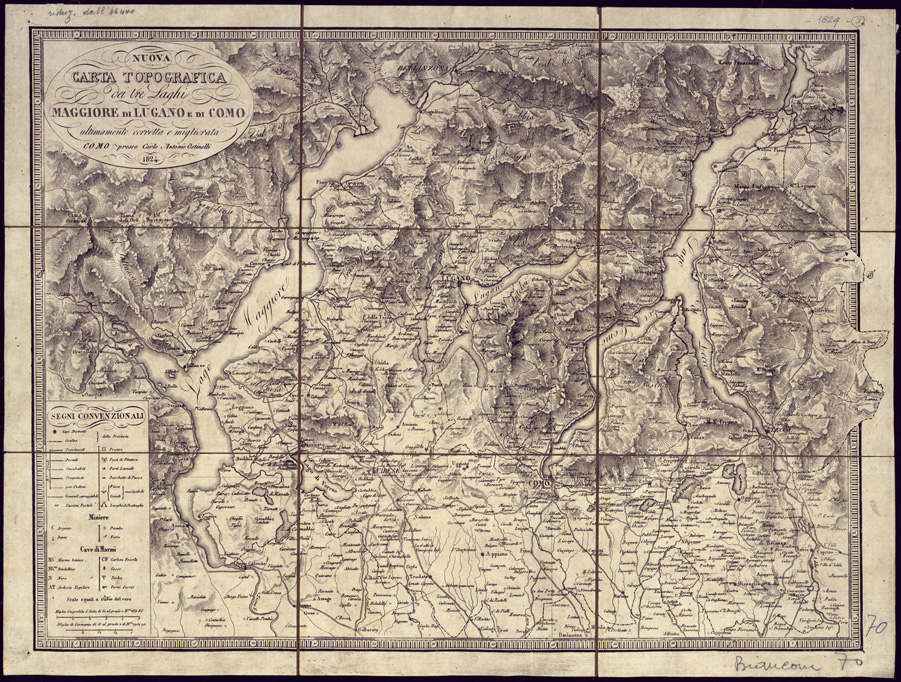 (N:13039) NUOVA CARTA TOPOGRAFICA DEI TRE LAGHI MAGGIORE, DI LUGANO, E DI COMO ULTIMAMENTE CORRETTA E MIGLIORATA. COMO PRESSO CARLO E ANTONIO OSTINELLI. (B0003147) Carte e stampe antiche: riproduzione digitale a 150 DPI