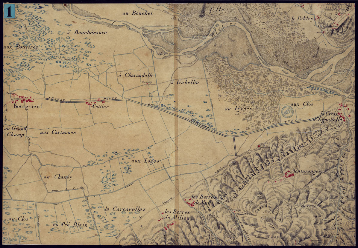 Disegno a penna a pi colori su carta lucida in quattro fogli grandi e tre mezzi fogli. Nel documento rappresentato l'ultimo tratto della valle inferiore dell'Arc da Aiguebelle alla sua confluenza nell'Isere e la parte dell'adiacente corso dell'Isere. In calce ad uno di questi la data e la firma "Turin le 24 janvier 1818. JOSEPH CONTI Ing.e". Il titolo certamente posteriore al disegno della carta. Disegno con orografia a tratteggio, ricco di nomi e di particolari relativi specialmente all'alveo del fiume e delle sue numerose ramificazioni. Di uno dei quattro grandi fogli vi anche una copia artisticamente finita in disegno su carta. (Cfr. al n. 27 d'Ordine - Docum. d'Arch. 9902)