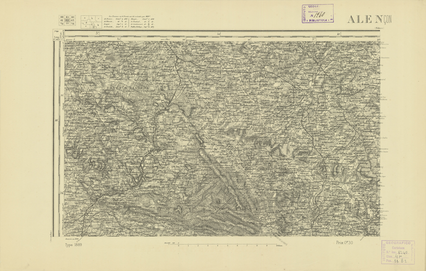 Paris. Service Gographique de l'Arme, 1889. Ebbe origine dall'Edizione zincografica in quarti di foglio, stabilita dal 1879, per la carta detta de "L'Etat-Major". Infatti non rispondono pi il sistema della riproduzione zincografica alle esigenze che la revisione dei fogli imponeva, per un inevitabile logoramento dei rami originali, fu proposta dapprima la correzione degli zinchi, ma questo, importando un lavoro lungo e gravoso, si adott il procedimento galvanico. I rami galvanici ottenuti e corretti secondo questo sistema presero il nome di "dition type 1889". Allo scopo di facilitare l'incisione fu adoperata la suddivisione in quarti di foglio come per l'edizione zincografica. La revisione dei fogli di questo tipo non fu iniziata che nel 1893. Dal catalogo del S.G.A. risultano mancanti a questa edizione i dipartimenti della "Moselle", del "Bas-Rhin" e del "Haut-Rhin" per i quali non esiste che una edizione in fogli interi aggiornata nel 1901.