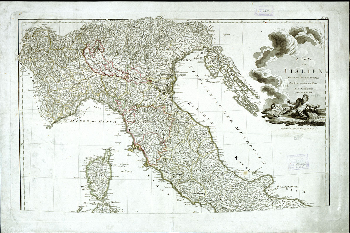 (N:1016) KARTE VON ITALIEN VERFASST VON HERRN D'ANVILLE NEU HERANS GEGEBEN VON HERRN F. A. SCHRCEMBEL 1788 (CARTA D'ITALIA COMPILATA DAL SIG. D'ANVILLE, NUOVAMENTE EDITA DAL SIG. F.A. SCHRAEMBL, 1788) (Foglio nord). (B0014047) Carte e stampe antiche: riproduzione digitale a 150 DPI