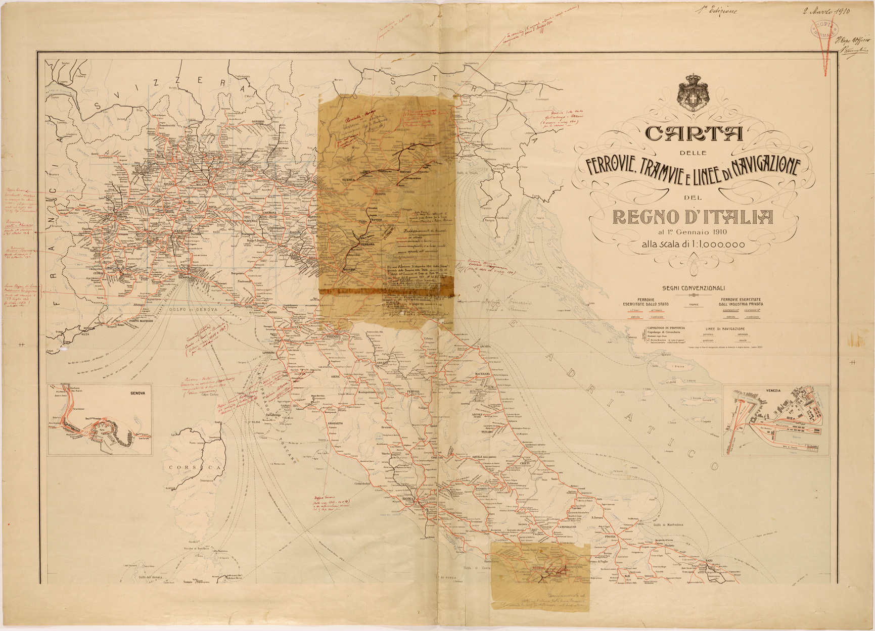 Carta in 2 fogli Nord - Sud realizzata dall' IGM e pubblicata in concorso con la Direzione Generale delle Ferrovie dello Stato, nelle due tavole sono inseriti particolari di varie zone e piante di citt e la ferrovia della colonia Eritrea.