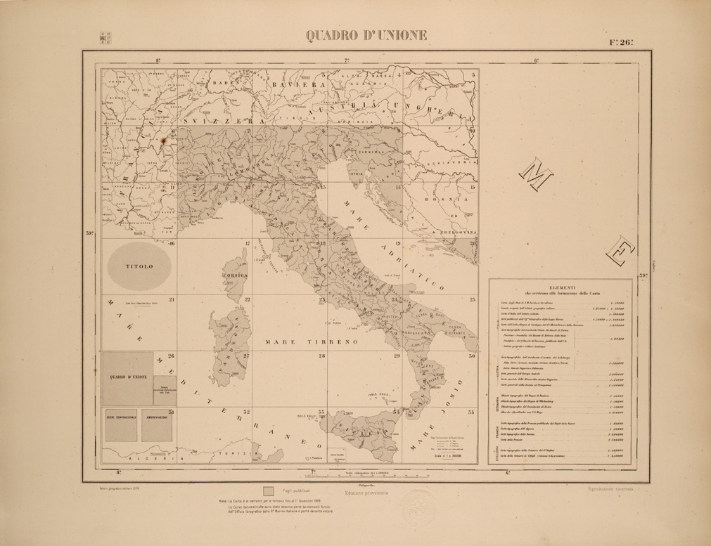 (N:26498) CARTA COROGRAFICA DEL REGNO D'ITALIA E DELLE REGIONI ADIACENTI FOGLIO 26 QUADRO D'UNIONE (SE000060) Carte e stampe antiche: riproduzione digitale a 150 DPI