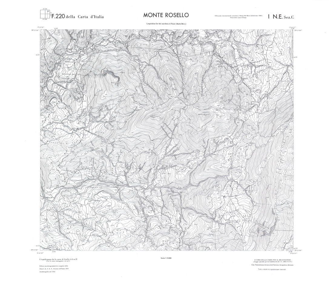 Rilievo eseguito da ditte private a cura della Cassa per il Mezzogiorno (legge speciale per la Calabria 26/11/1955 n1177) con l'assistenza tecnica dell' I.G.M. Rilievo aereofotogrammetrico,proiezione naturale,stampa in nero,equidistanza tra le curve mt.10. Le fotoriprese aeree furono eseguite nel 1954, l'elemento cartografico era la sezione di tavoletta, ossia 1/4 di tavoletta, distinta dalle lettere A;B;C;D.