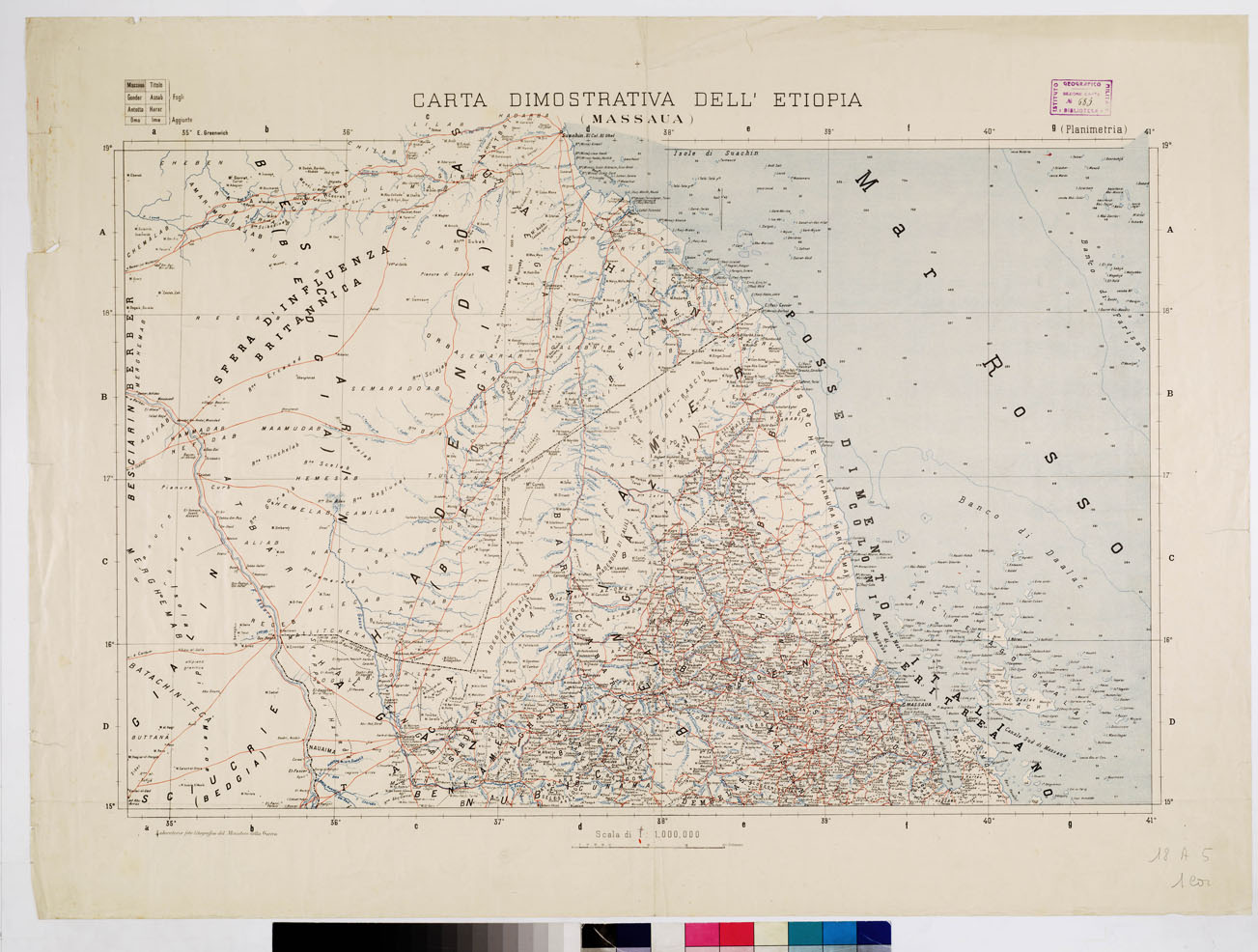 COMPILATA DAL CAPITANO DI STATO MAGGIORE E. DE CHAURAND. COMANDO DEL CORPO DI STATO MAGGIORE. Le disposizioni per la compilazione di questa carta, che si voleva coordinasse in una rappresentazione grafica la maggior quantit di documenti, itinerari, rilievi degli esploratori dell'Etiopia allora esistenti, venivano prese nel 1888. L'incarico della raccolta del materiale veniva affidato al generale Dal Verme che fece riunire tutti i documenti esistenti originali, editi e inediti, tra i quali si annoverano rilievi e memorie di Stati Maggiori egiziano e inglese, di ufficiali o esploratori nostri, lettere di viaggiatori, rapporti di ricognizioni affettuate dal Governo Italiano della Colonia. I rilevamenti geodetici che servirono di base alla costruzione della carta sono quelli dell'I.G.M. dell'Ufficio Idrografico della Marina, della spedizione inglese del 1868 e del D'Abbadie.