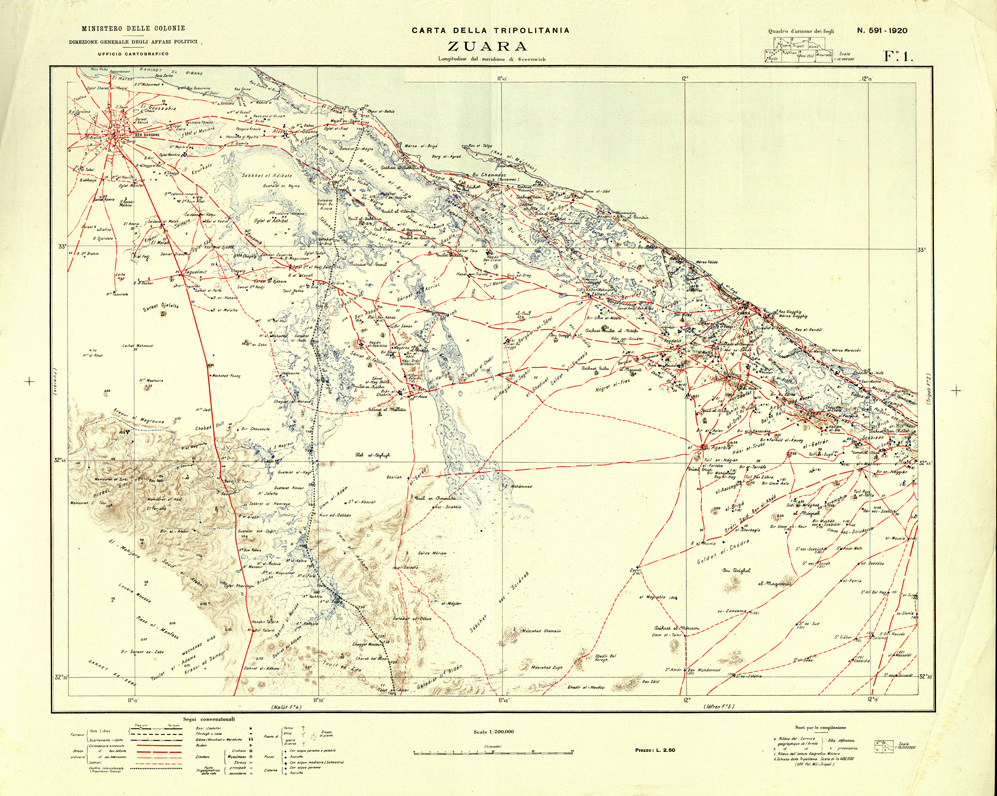 Carta dell' ufficio cartografico del Ministero delle Colonie, compilata nel 1919 sulla base di rilievi e della carta della Tripolitania alla scala di 1:400.000, gli originali sono disegnati a penna su carta da disegno montata su tela alla scala di 1:150.000 per la riduzione fotomeccanica alla scala di 1:200.000, la carta composta da 7 fogli ma all' archivio dell' IGM ne furono consegnati solo 3 e precisamente i fogli: 1 Zuara - 2 Tripoli - 3 Homs.