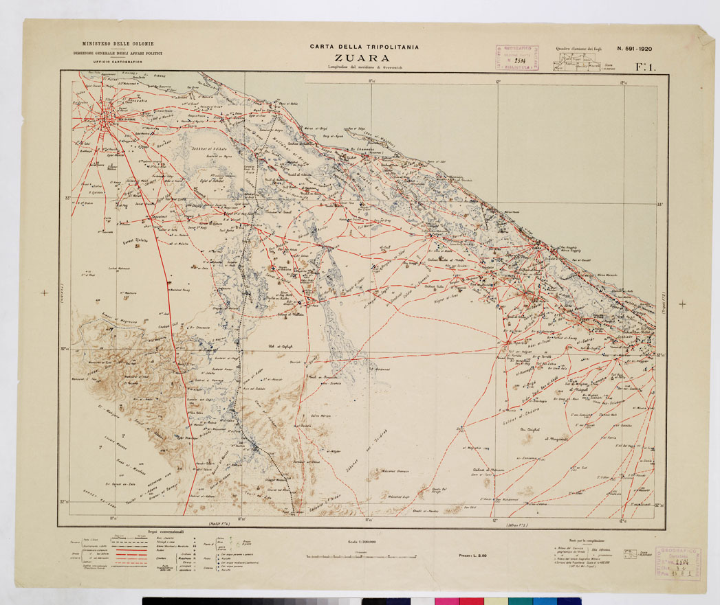 Tre dei fogli della carta dimostrativa che ultimata comprender anche i fogli Nalt, Jfren, Beni Ulid, Misurata. La stampa policroma con ferrovie, confini, centri abitati, case, moschee in nero, piante isolate o gruppi di piante in verde, pozzi e cisterne in azzurro, carovaniere, sentieri in rosso. Ogni foglio porta indicate le fonti usate per la compilazione. Vi anche inserito un quadro d'unione alla scala di 1:10.000.000. I tre fogli comprendono la zona costiera da Ben Bardane (Tunisia) a Zliten e nell' interno fino oltre il 32 30' lat. nord. Le longitudini sono riferite al meridiano di Greenwich.