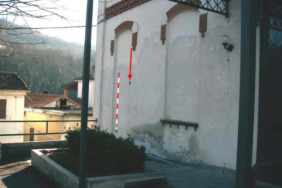 (CSO) Bullone in ghisa infisso presso lo spigolo sinistro della facciata principale del fabbricato