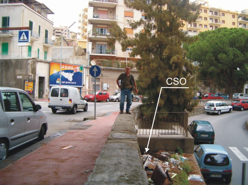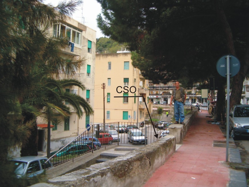 (CSO) - Chiusino in ghisa posto a circa 30 cm dal muro di sostegno della strada e 30 cm dal muro della scaletta per il Rione S.Licanto.