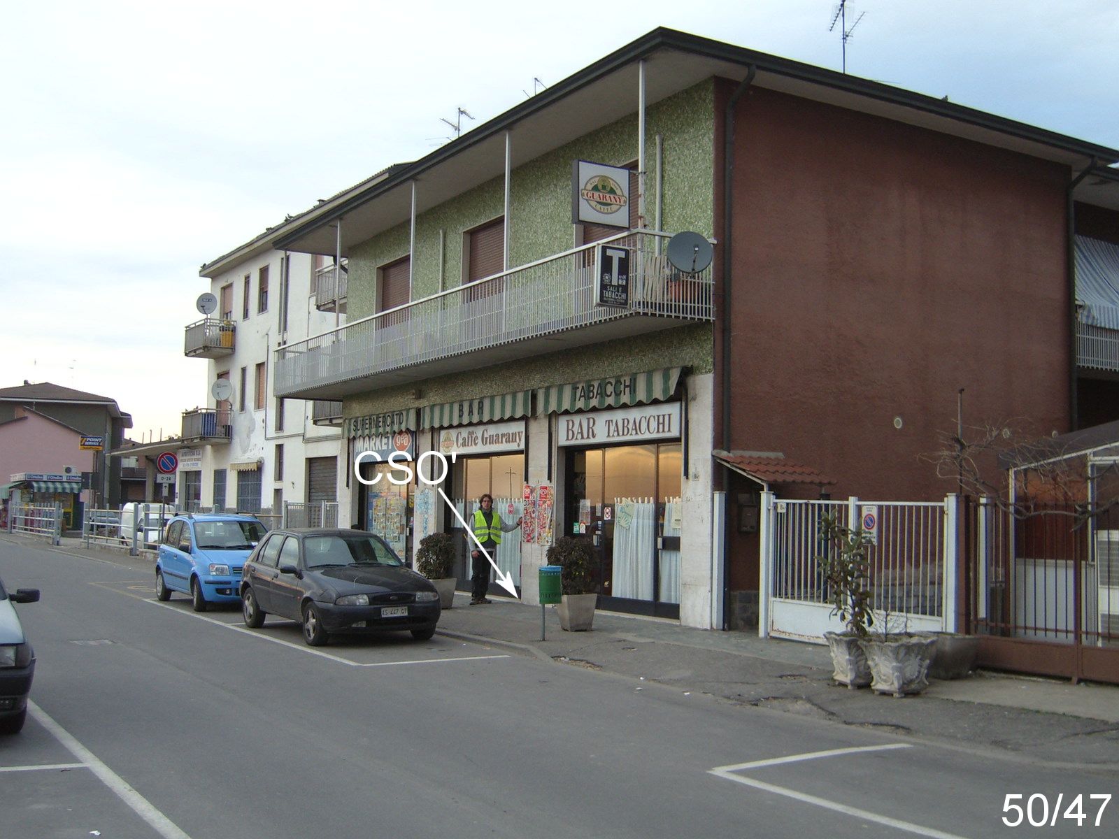(CSO') - Cerchio inciso del Catasto sulla soglia in pietra della vetrina di sinistra del Bar/Tabacchi di proprietà La Ganga, dall'altra parte della Statale rispetto al CSO, al numero civico 8.
