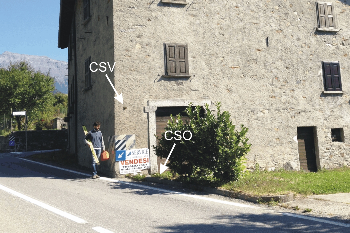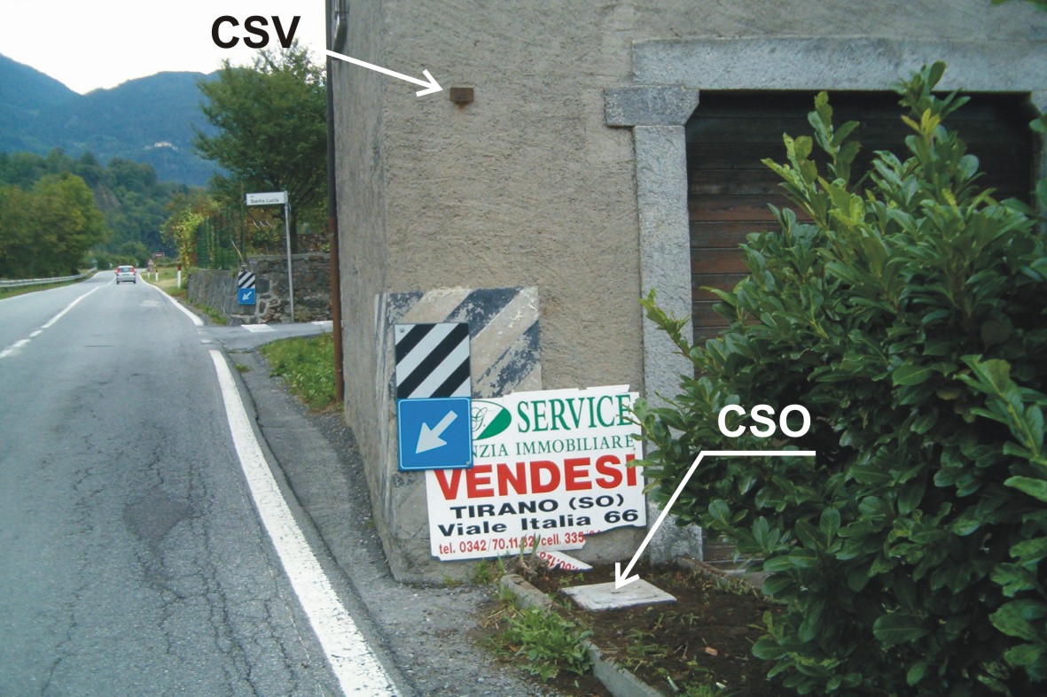 (CSO) - Chiusino in ghisa di III categoria protetto da chiusino in cemento posto alla base della facciata di destra, spigolo lato strada, di un fabbricato in angolo con via Santa Lucia.