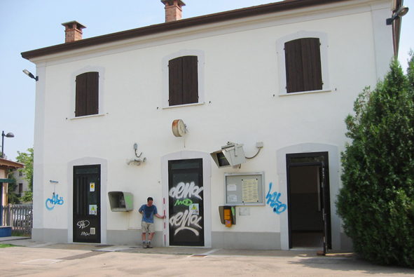 (CSV) - Piastrina antica IGM infissa in facciata alla stazione, lato binari, a sinistra della porta centrale.